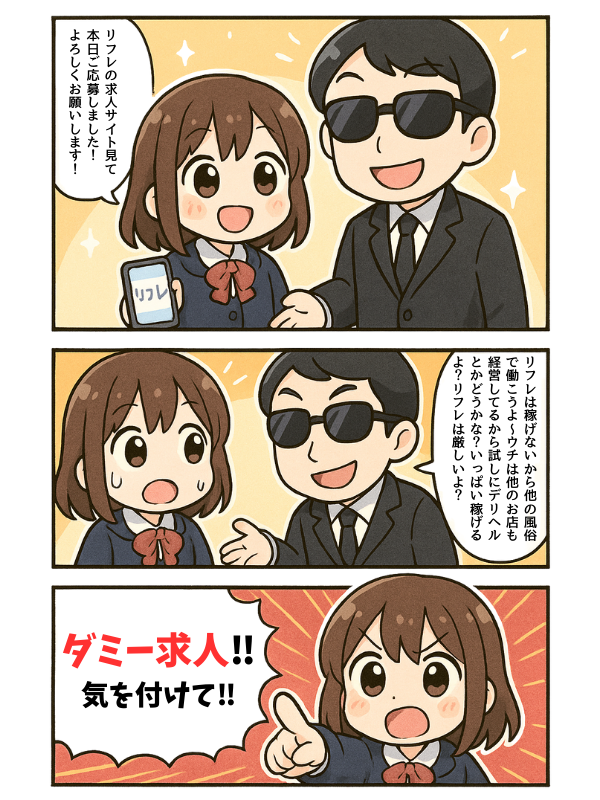 中には、リフレ店やソフトサービス店の面接に行ったのに、全く別の風●店へ強引に誘導された…そんな事例もあるそうです。これはいわゆる 「ダミー求人」 と呼ばれ、虚偽の内容で人を釣る犯罪まがいの行為です。