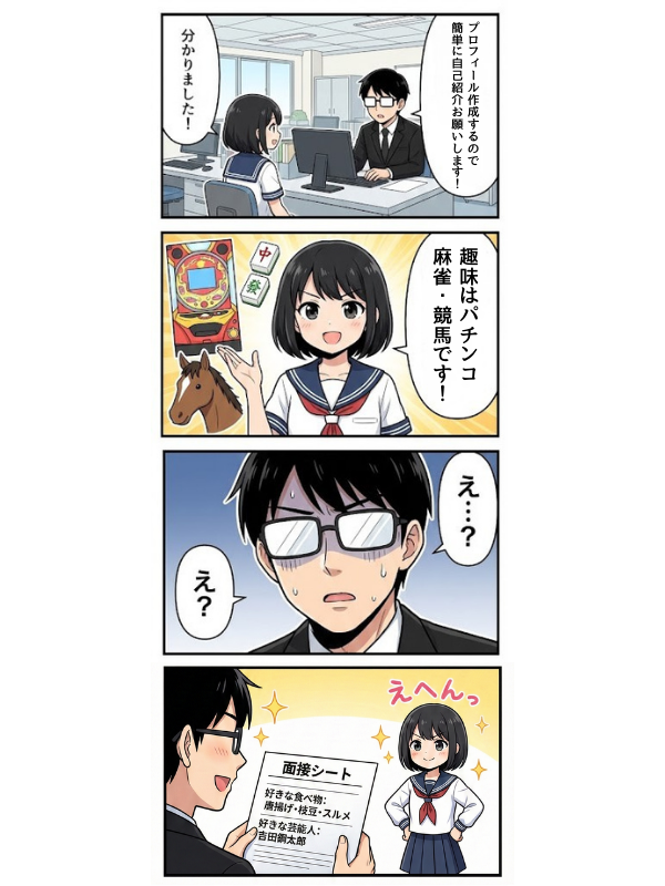 空欄だらけのテキトーな子もいれば、空欄無くぎっちり記入する真面目な子もいます。記入した内容で彼女らの全ては図れませんが特徴を掴むことが容易にできるのです。