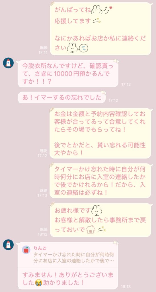 「分からないことはその場ですぐに聞いてね、なんでも相談してね」と伝えると、初めての接客に向かった直後にすぐに質問LINEが⬇️